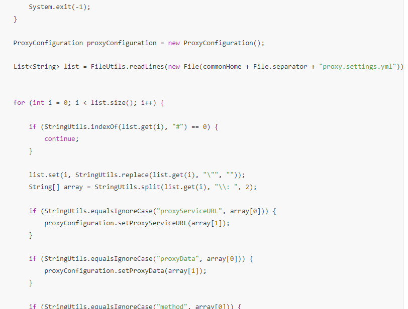 List<String> list = FileUtils.readLines(new File(commonHome + File.separator + "proxy.settings.yml"));